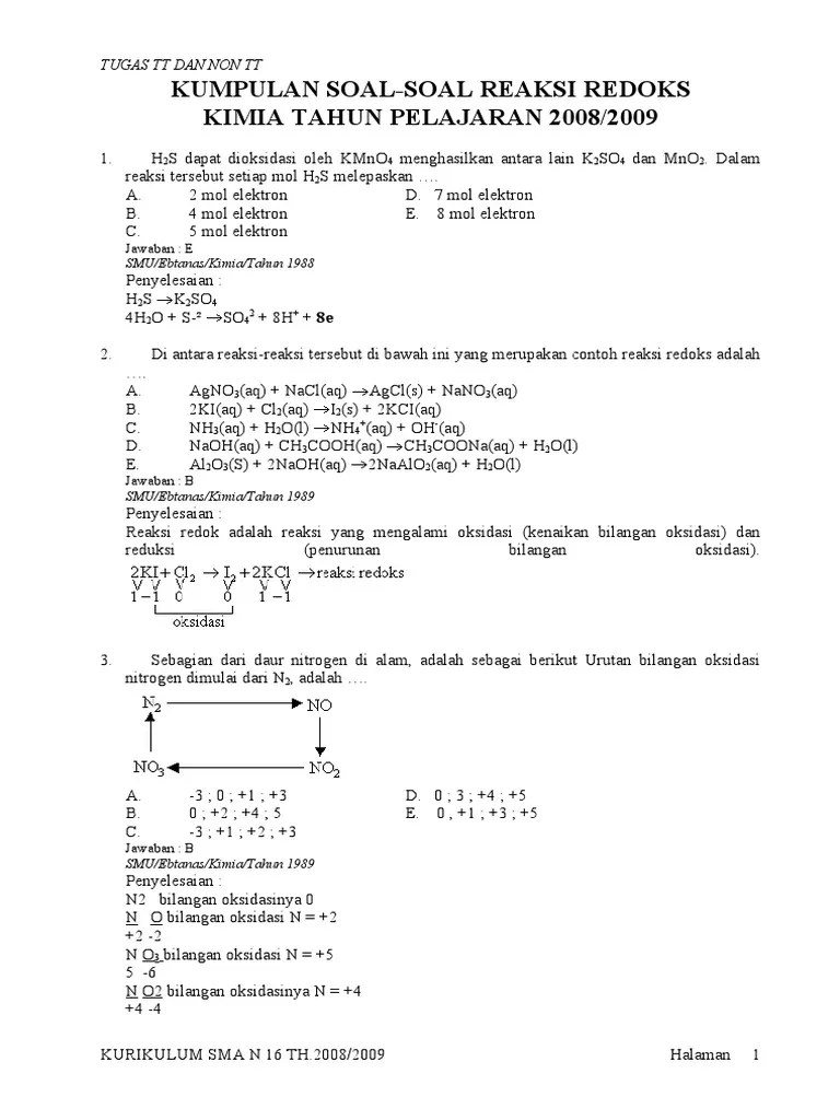Tentukan reduktor, oksidator, hasil oksidasi, dan hasil reduksi pada reaksi redoks berikut ini: Contoh reaksi redoks pengertian beserta penjelasannya. Soal x 2 reaksi redoks. 1) h2s dapat dioksidasi oleh kmno4 menghasilkan antara lain k2so4 dan mno2. Redoks (reduksi dan oksidasi) kimia beserta contoh soal dan jawaban . Reaksi redoks adalah peristiwa yang melibatkan reaksi reduksi dan oksidasi yang berlangsung secara bersamaan. Berikut ini penjelasan lengkap tentang reaksi redoks, penyetaraan reaksi redoks menggunakan metode perbuaha biloks dan setengah reaksi, contoh soal. Dalam reaksi tersebut setiap mol . Contoh soal kimia kelas 12 bab 1 sifat koligatif larutan beserta jawaban atau . Ada dua zat yang berperan . 20 latihan soal elektrokimia kimia kelas 12 beserta pembahasannya. Berikut contoh soal dan jawaban dari bilangan oksidasi yang bisa jadi referensi. Jadi, biloks n pada no2 = +4.